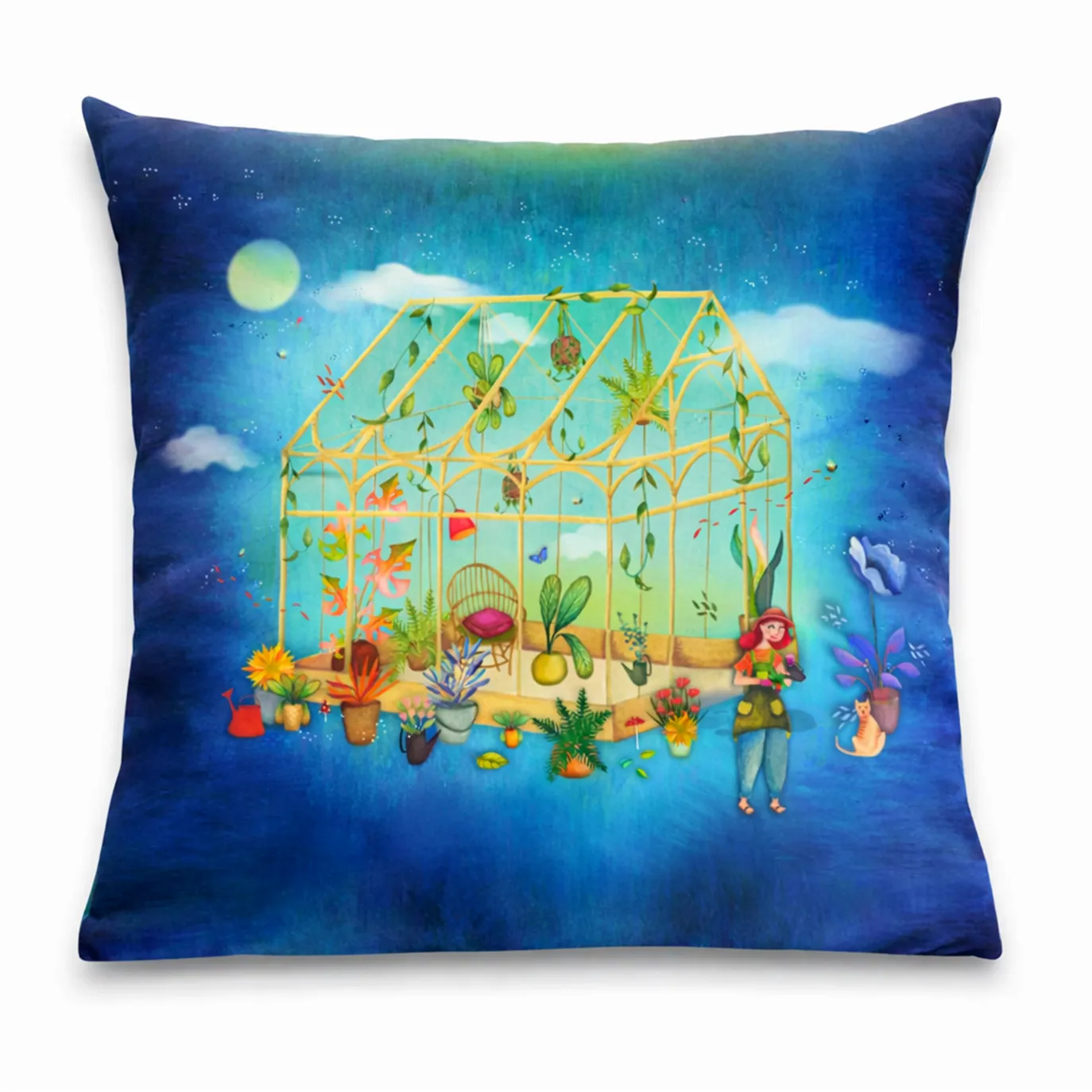 Ce coussin carré décoratif, confectionné avec soin, est sublimé par une impression numérique sur velours qui intensifie la profondeur des couleurs et offre un toucher chaleureux et raffiné. Les détails graphiques — plantes suspendues, feuillages luxuriants, jeux de lumière — apportent une dimension artistique forte à votre intérieur.