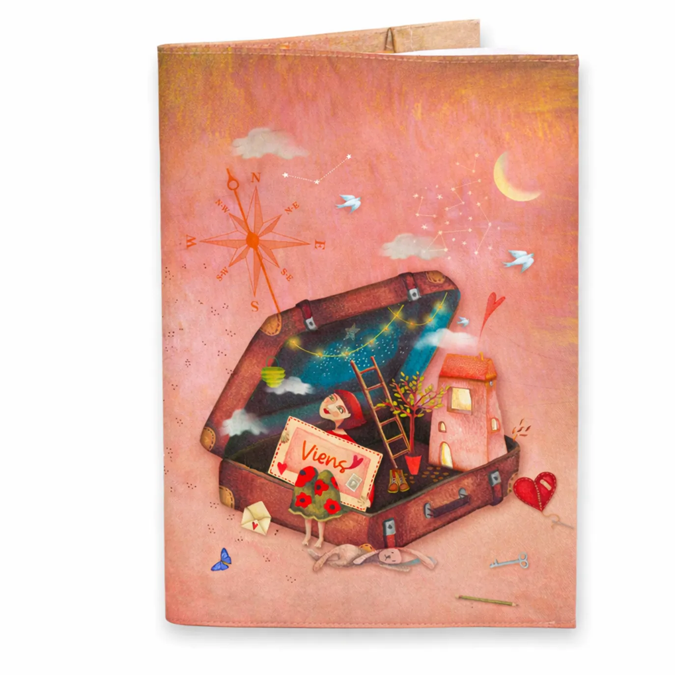 Sur son velours imprimé, la valise s’ouvre comme un coffre aux trésors. À l’intérieur, une maison aux fenêtres éclairées symbolise le foyer intérieur que l’on porte en soi. Des trésors d’enfance et objets personnels y reposent avec douceur. Un arbre s’élève vers le ciel, promesse de croissance. Une échelle invite à l’élévation. Sous une nuit étoilée, les guirlandes lumineuses brillent, les constellations dessinent des chemins, la boussole indique la direction du cœur, tandis que les colombes apportent une sensation de paix.